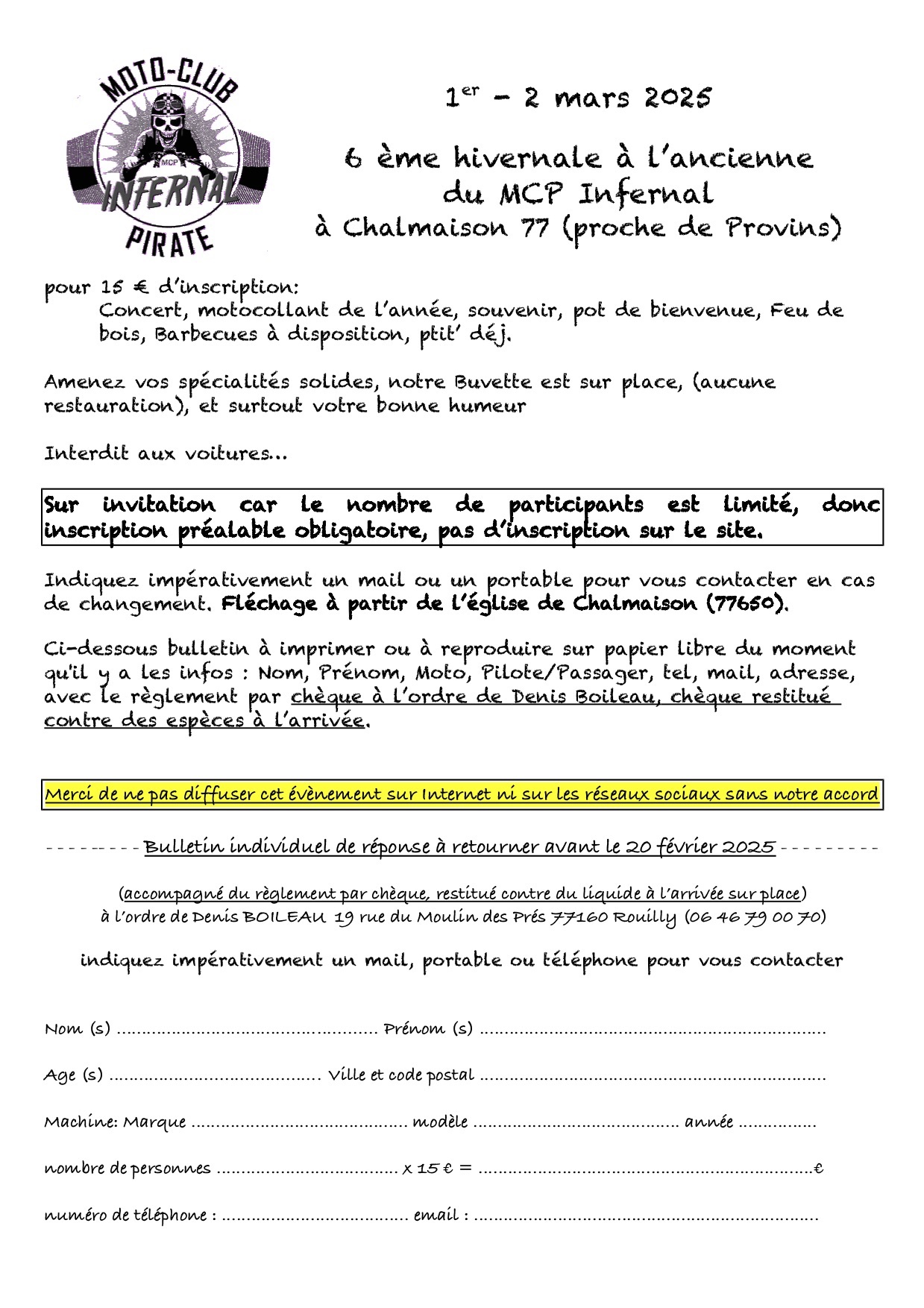 Ci-dessous bulletin à imprimer ou à reproduire sur papier libre du moment qu'il y a les infos : Nom, Prénom, Moto, Pilote/Passager, tel, mail, adresse, avec le règlement par chèque à l’ordre de Denis Boileau, chèque restitué contre des espèces à l’arrivée.